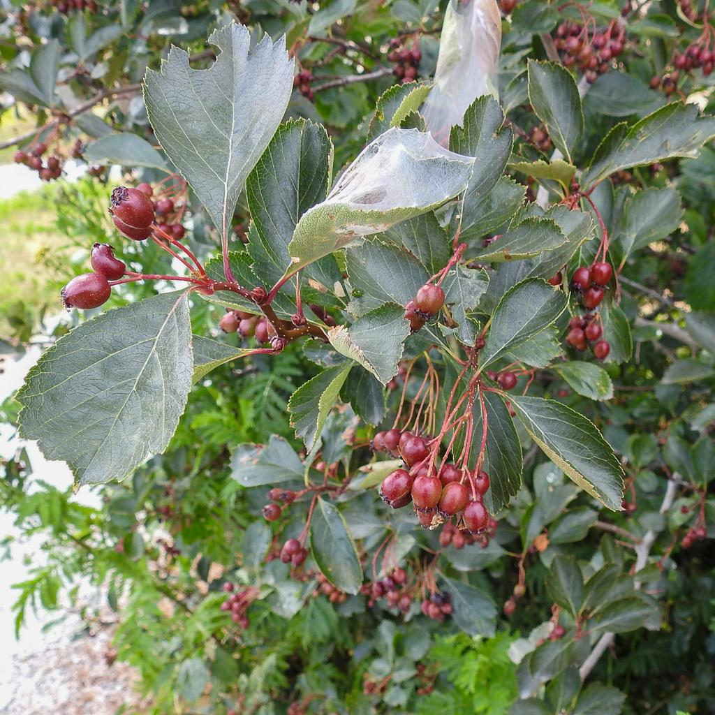 Many varieties of hawthorn can be found in eastern North America. One example is Downy Hawthorn, which has fewer thorns and the fruit are light red or orange.